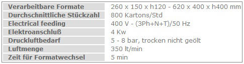 FA46 Der FA46 Kartonaufsteller öffnet und faltet vorgeklebte Zuschnitte vom Typ Fefco und schließt sie anschließend mittels Klebeband oder Heißleim. Er wurde konzipiert für einen schnellen Formatwechsel und Bedienerfreundlichkeit, die sich vor Allem durch den selbsterklärenden Berührungsbildschirm und die niedrige Ladehöhe des Magazins ergibt. Dank seiner universellen Einsatzmöglichkeiten bietet sich der FA46 Kartonaufsteller für fast alle Verpackungslösungen dieser Art an, von Obst und Gemüse über den gesamten Lebensmittelbereich bis hin zu Industrielösungen. Technische Daten